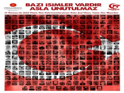 15 Temmuz'da, FETÖ'nün hain darbe girişimine direnerek ülkemizin bekası uğruna canlarını feda eden tüm kahramanlarımızı minnet ve şükranla anıyor, şehitlerimize Allah'tan rahmet diliyoruz. Tarih boyunca bu vatan için göğsünü siper edip ahirete intikal edenlerin ruhları şad olsun.